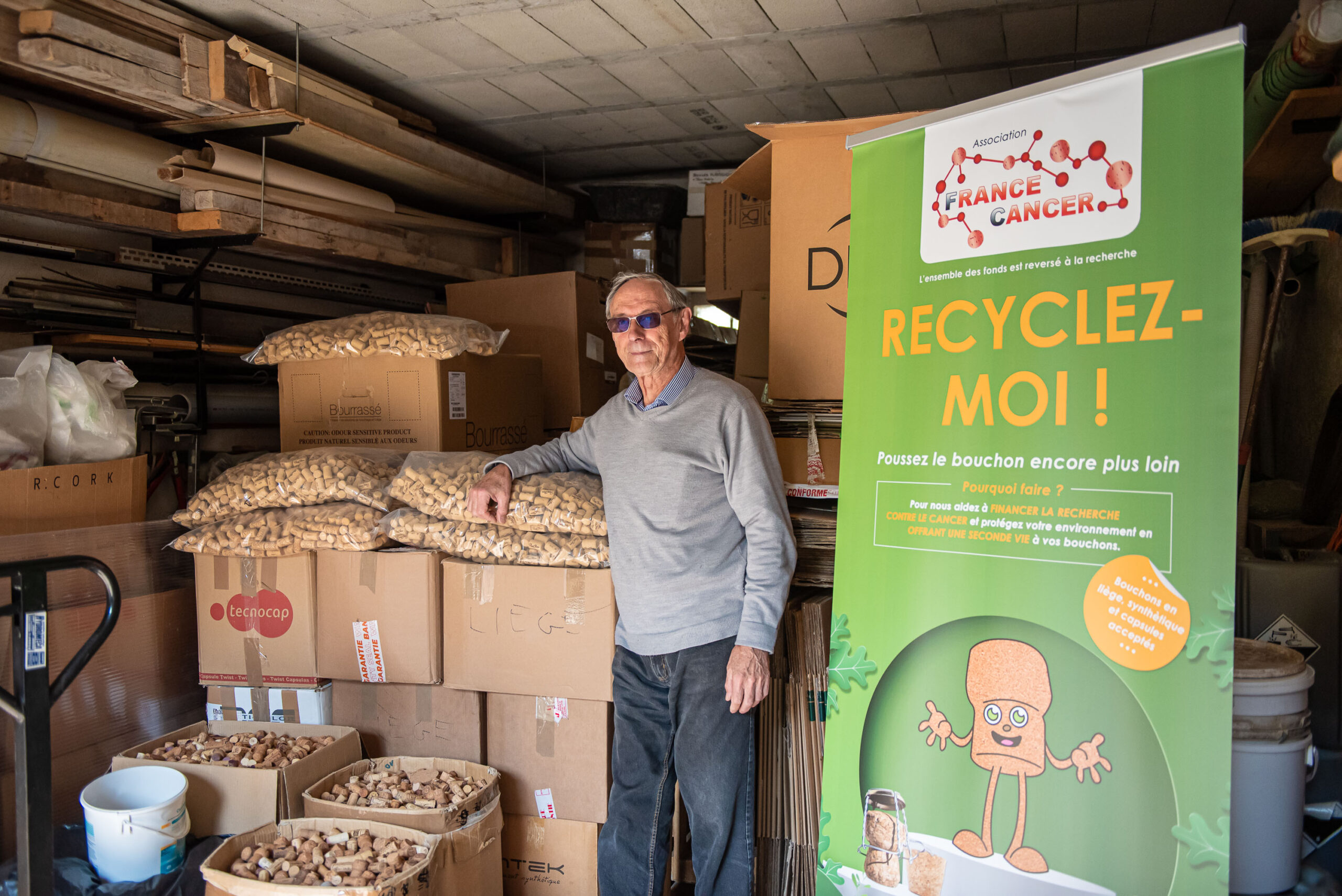 En 2009, Jean et Sylviane décident de rejoindre l’aventure de France Cancer et se lancent dans la collecte de bouchons pour financer la recherche contre le cancer. Ils parcourent inlassablement un rayon de 80 kilomètres autour de Mondragon, récoltant des bouchons dans des départements voisins.